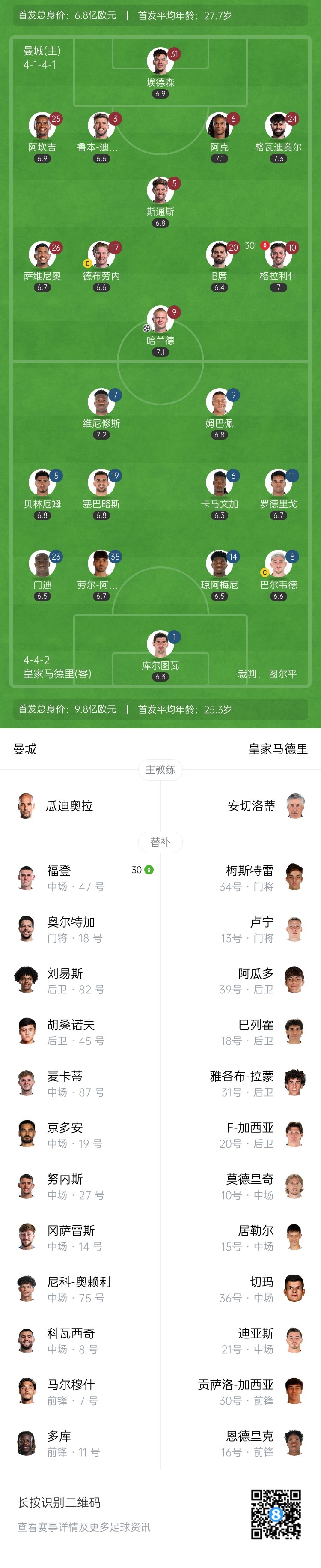 半場-曼城暫1-0皇馬 哈蘭德破門格瓦迪奧爾助攻格拉利什傷退