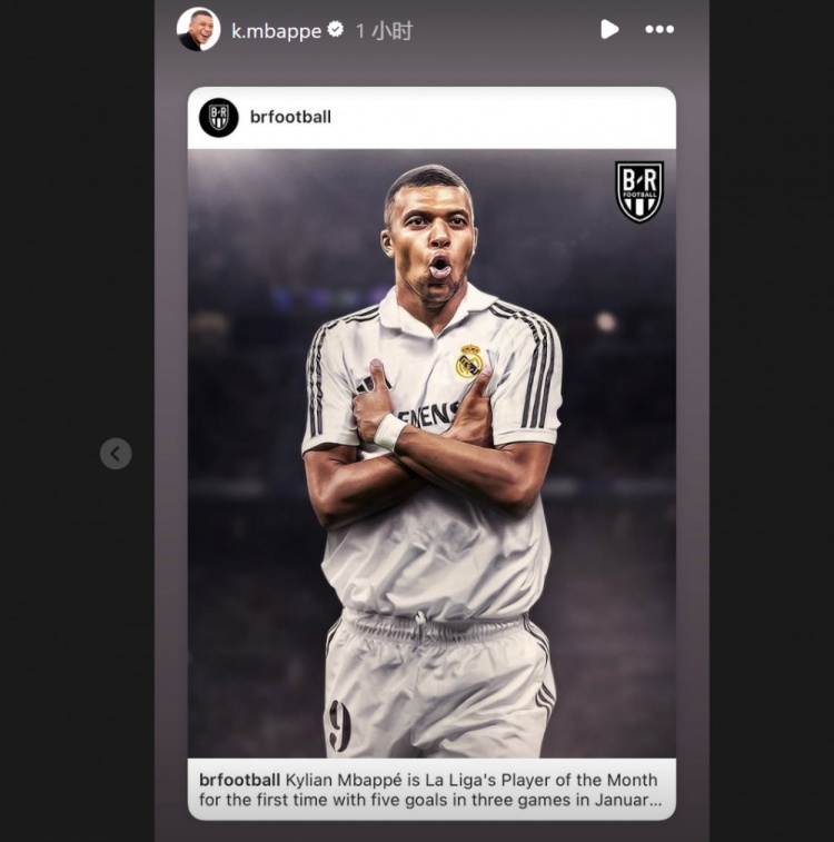 3場5球被評為西甲1月最佳球員!姆巴佩社媒轉(zhuǎn)發(fā)紀念