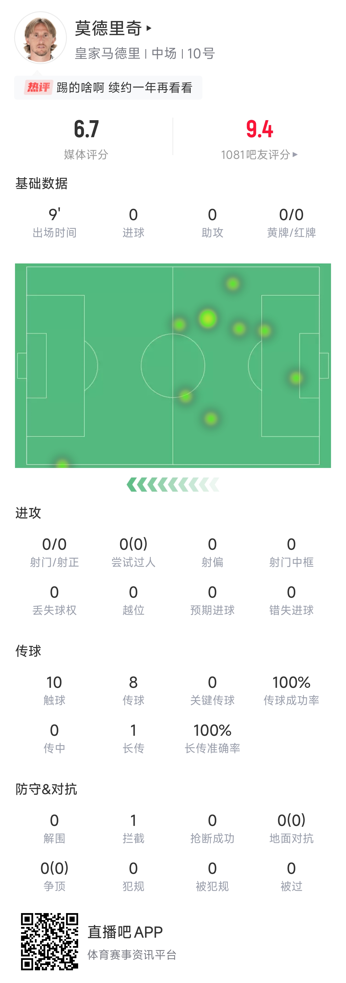 在本場僅有的10分鐘替補時間里,魔笛有著以下數(shù)據(jù):10次觸球0丟失球權,傳球8次成功率100%,1次長傳100%成功,1次攔截,0犯規(guī)0被過。