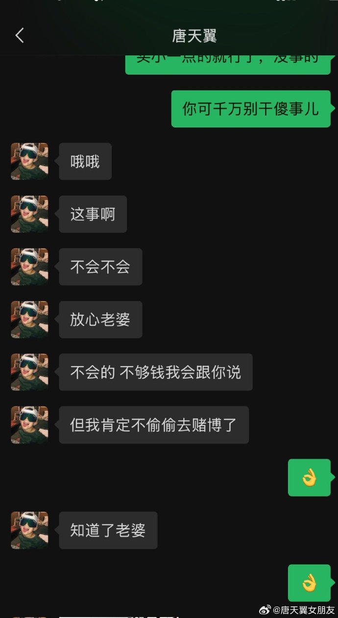 難收?qǐng)?!“唐天翼女友”賬號(hào)再曝聊天記錄,內(nèi)含唐天翼戒賭保證書
