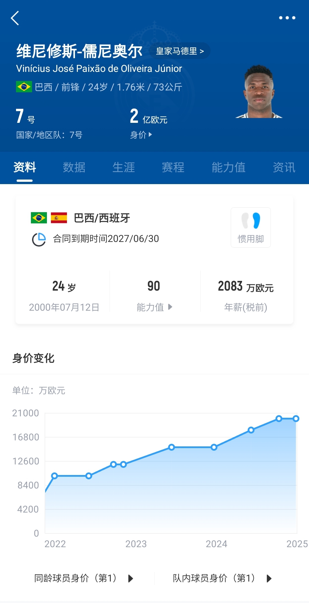 本賽季24歲的維尼修斯為皇馬出戰(zhàn)30場比賽,貢獻16球11助,目前球員德轉身價2億歐。