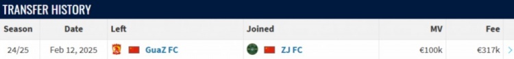 德轉(zhuǎn)顯示原廣州隊門將霍深坪加盟浙江隊,轉(zhuǎn)會費31.7萬歐