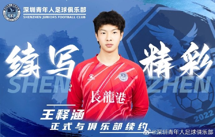 王釋涵今年20歲,司職門將,球員去年年初從上海申花轉(zhuǎn)會(huì)深圳青年人,此次順利續(xù)約。