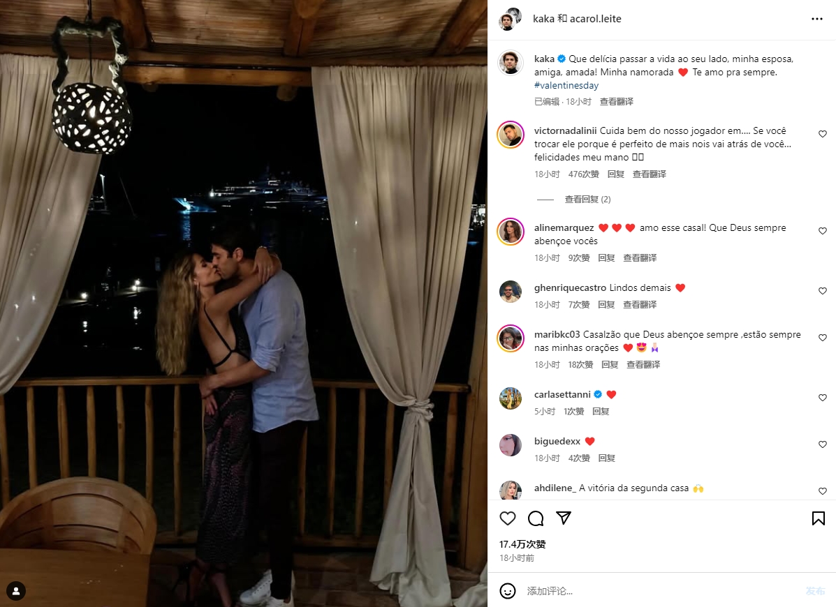 02月15日訊 情人節(jié),卡卡社媒曬出與妻子卡洛琳娜(Carolina Batista Leite)親吻照。