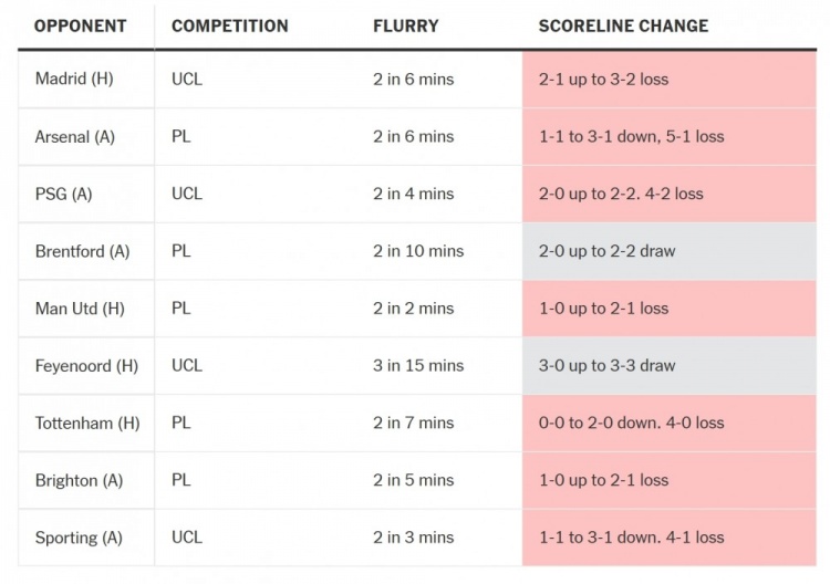 曼城最近9場(chǎng)在10分鐘內(nèi)連丟兩球的比賽統(tǒng)計(jì)