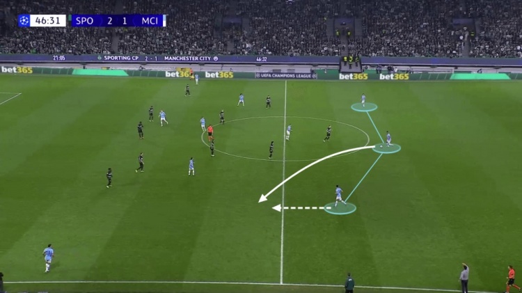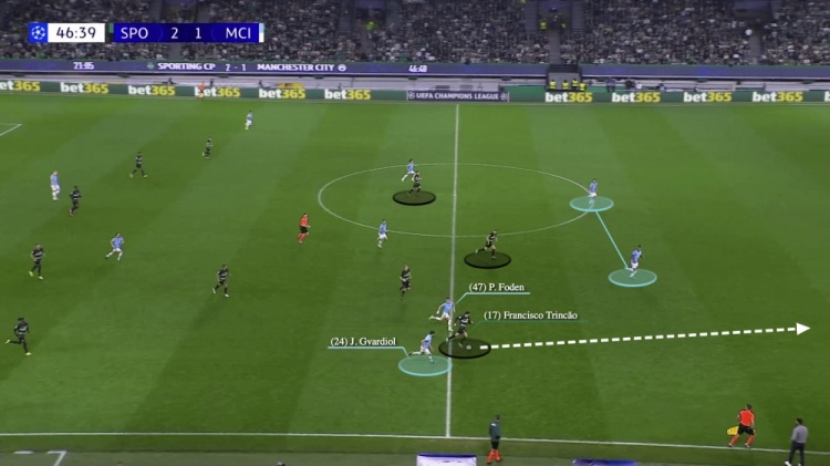 最明顯的例子是對(duì)陣葡萄牙體育的比賽。曼城在下半場(chǎng)一開(kāi)始就失誤了,一個(gè)簡(jiǎn)單的二過(guò)一足以讓貢薩爾維斯從他們的中場(chǎng)身后進(jìn)入。他傳球給邊后衛(wèi)馬克西米利亞諾-阿勞霍,然后皮球越過(guò)了埃德森把守的大門。阿勞霍破門后僅86秒,葡萄牙體育就獲得了一個(gè)點(diǎn)球。從開(kāi)球開(kāi)始,曼城就立即轉(zhuǎn)變?yōu)?-1-3-3陣型來(lái)對(duì)陣葡萄牙體育的五后衛(wèi)。阿坎吉將球傳給了格瓦迪奧爾,后者在理論上來(lái)說(shuō)是有足夠向前推進(jìn)的空間。