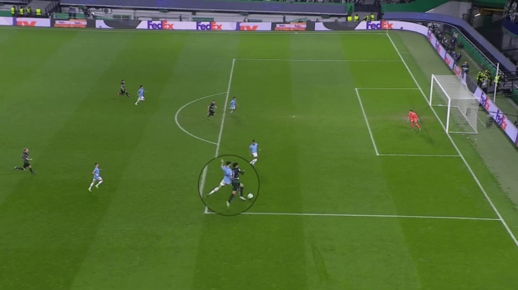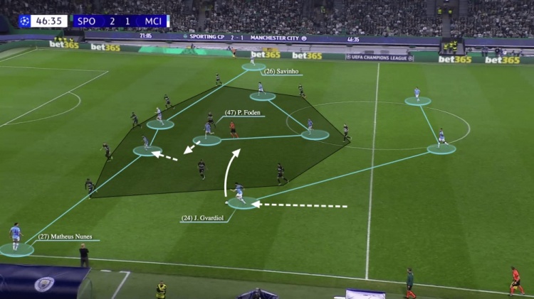 他有三個(gè)合理的選擇:傳給馬修斯-努內(nèi)斯,或者將球轉(zhuǎn)移到右路的薩維尼奧,亦或者向后傳遞。但格瓦迪奧爾都沒(méi)有選,而是選擇了最困難的路線,傳球給身處重兵集結(jié)區(qū)域的福登,而且他還沒(méi)有足夠的傳球精度。葡萄牙體育獲得了球權(quán),立即進(jìn)入了格瓦迪奧爾推進(jìn)留下的空間。