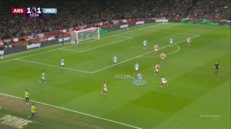 福登、薩維尼奧,再加上曼城的三名中場(chǎng)球員,他們?cè)谇蜷T附近有太多的球員,使得他們很難長(zhǎng)傳球調(diào)度(哈蘭德在中線附近,沒(méi)有出現(xiàn)在這個(gè)鏡頭中)。