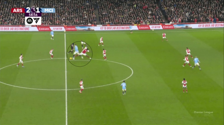 斯凱利接球、轉(zhuǎn)身和突破,都沒(méi)有受到什么阻礙。他身邊有三名曼城球員,但都沒(méi)有嘗試搶斷。斯通斯在此時(shí)的防守表現(xiàn)得很糟糕,他后撤,試圖擋住對(duì)方的射門,但在整個(gè)過(guò)程中都沒(méi)有注意埃德森——或許最初他能配合埃德森,讓阿森納的射門沒(méi)有那么舒服。