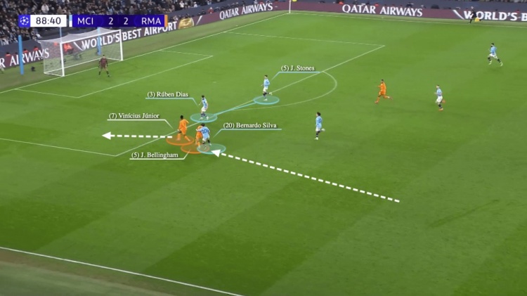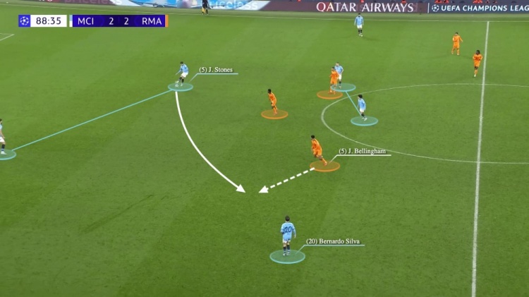 甚至在對(duì)陣皇馬的比賽中,此前一直很可靠的斯通斯,也出現(xiàn)了失誤。他在比賽中扮演6號(hào)角色,在開(kāi)局后移動(dòng)到了左中后衛(wèi)的位置上。他傳球給貝爾納多-席爾瓦,就不是一個(gè)合適的選擇。貝林厄姆攔截了這次傳球,并帶球向前推進(jìn),貝爾納多-席爾瓦在禁區(qū)外將其包夾,但這一次并沒(méi)有判罰。
