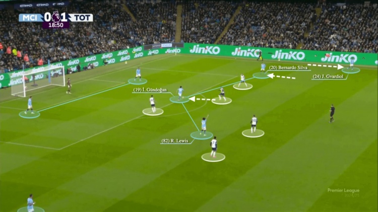 曼城的三名中場(chǎng)球員——里科-劉易斯、貝爾納多-席爾瓦和京多安——都已經(jīng)回收到了禁區(qū)附近,京多安將球帶到了禁區(qū)邊緣。貝爾納多-席爾瓦和格瓦迪奧爾則在邊路活動(dòng)。
