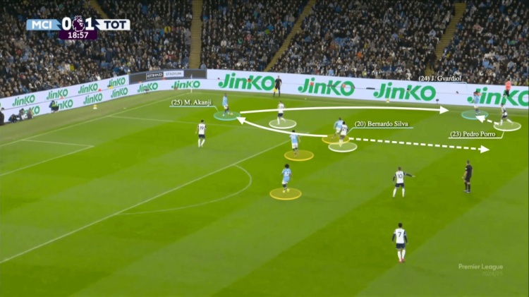 面對(duì)熱刺的壓迫,京多安傳球給貝爾納多-席爾瓦,又傳球給阿坎吉。這里的問(wèn)題是,所有三名中場(chǎng)球員(下圖黃點(diǎn))都靠得太近了,并且都是為球而戰(zhàn)——熱刺只需要兩名球員都能夠防住他們。當(dāng)阿坎吉傳球給格瓦迪奧爾之時(shí),貝爾納多-席爾瓦確實(shí)完成了一次滲透跑動(dòng),但曼城的慢速進(jìn)攻讓熱刺鎖定了他們。