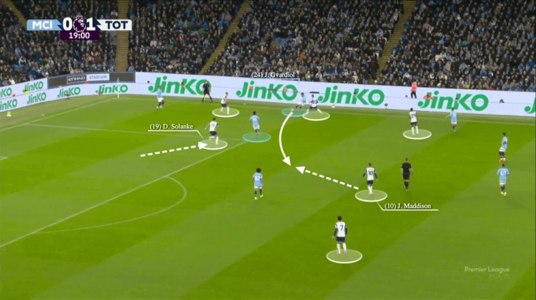 熱刺右后衛(wèi)波羅逼近,格瓦迪奧爾無(wú)法傳球給阿坎吉或者埃德森。因此他試圖小角度傳球給京多安。熱刺前鋒索蘭克預(yù)判了格瓦迪奧爾的動(dòng)作,而格瓦迪奧爾的傳球也出現(xiàn)了失誤——球直接傳給了麥迪遜。
