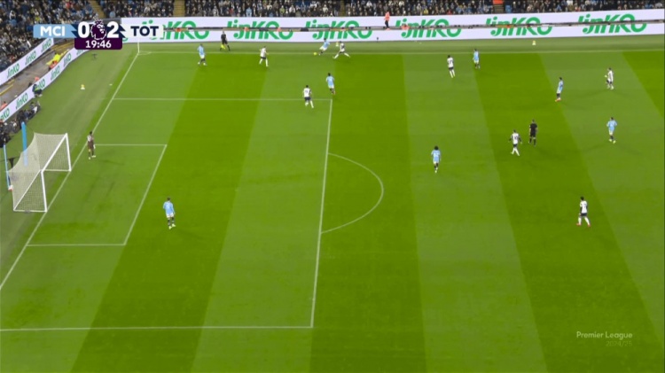 這其中一個(gè)復(fù)雜的問(wèn)題在于右后衛(wèi)凱爾-沃克的位置。他在邊線附近,也沒(méi)有出現(xiàn)在上圖之中。這樣的寬度對(duì)于曼城這樣的球隊(duì)確實(shí)是非常重要的,但一旦出現(xiàn)失誤,就會(huì)給對(duì)手留下很大的進(jìn)攻空間。也正是因?yàn)槿绱?,熱刺僅用兩次傳球就制造了一對(duì)一的機(jī)會(huì)。