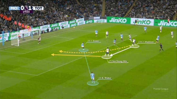 麥迪遜側(cè)身傳球找到孫興慜,然后完成突破。孫興慜直面埃德森,完成破門。