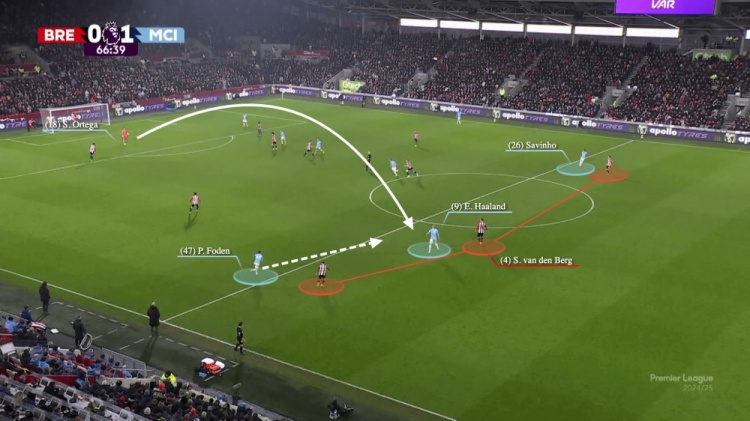那場(chǎng)比賽的早些時(shí)候,面對(duì)布倫特福德的人盯人逼搶,哈蘭德扛住了對(duì)方防守球員,給了福登和薩維尼奧跑動(dòng)的空間。