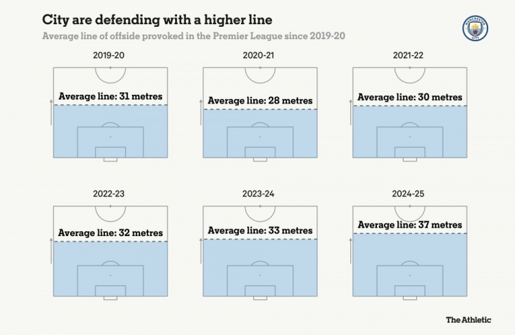 自2019/2020賽季以來(lái),曼城防線高度的變化統(tǒng)計(jì)