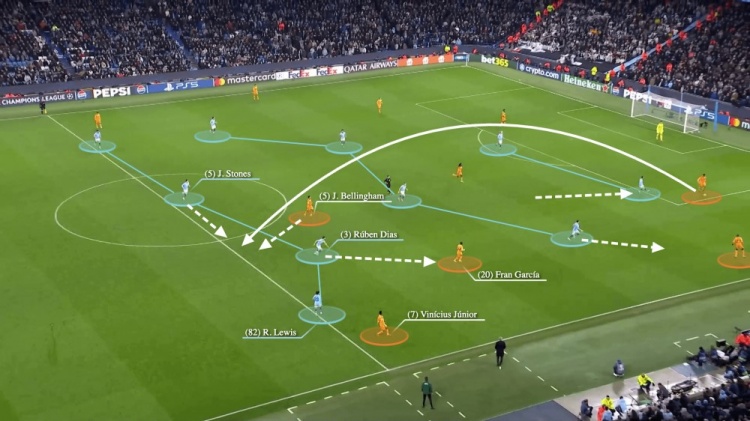 理想情況下,斯通斯和魯本-迪亞斯會(huì)形成默契的配合。雖然魯本-迪亞盯著弗蘭-加西亞,并試圖后撤,但斯通斯出現(xiàn)在一個(gè)更靠后的位置,使得貝林厄姆并沒(méi)有被緊盯,有了一個(gè)向前的機(jī)會(huì)。