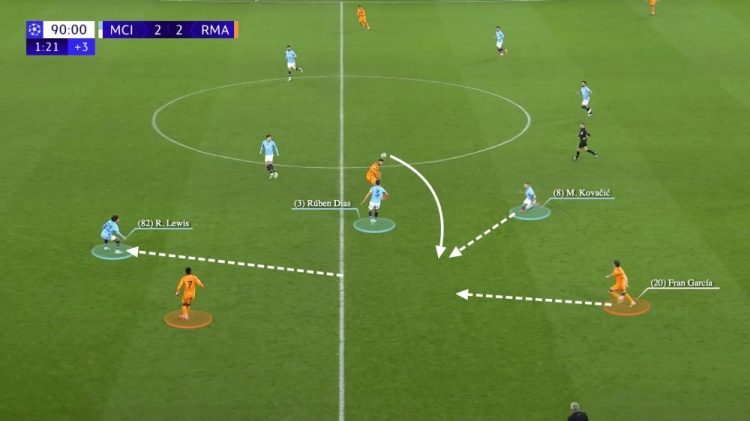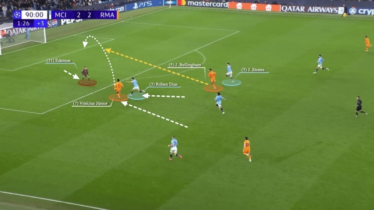 然而曼城的防守調(diào)整還是出現(xiàn)了失誤,因?yàn)榛蜀R用弗蘭-加西亞換下了姆巴佩。皇馬以短傳為主,并在曼城逼搶之時(shí)改用長(zhǎng)傳推進(jìn)。