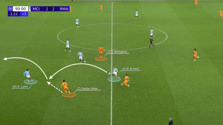 盡管科瓦西奇回過(guò)神來(lái),完成了一次搶斷,但獲得球權(quán)之后的他,應(yīng)該將這個(gè)球直接送到前場(chǎng),或者回傳給埃德森。相反,他將球傳給了劉易斯,且傳球并沒(méi)有成功。維尼修斯率先得到了球,并突破劉易斯,快速向前推進(jìn)。