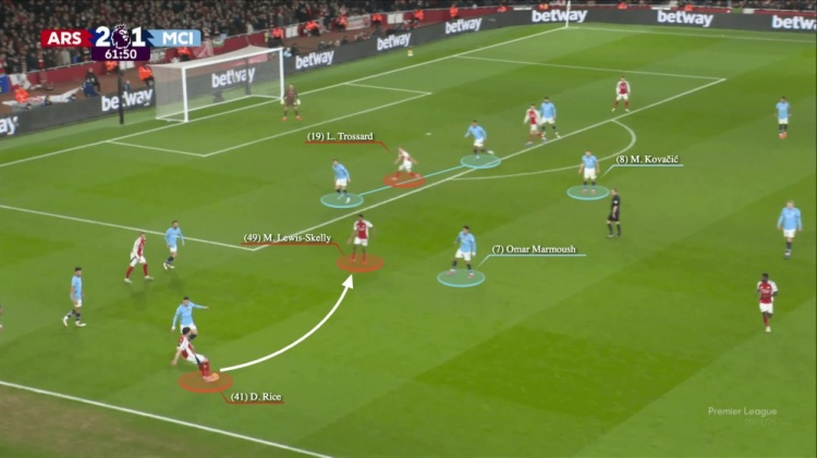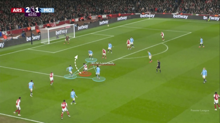 10號(hào)特林康接球,福登和格瓦迪奧爾都在他的身后。曼城有兩名中后衛(wèi),而阿坎吉也在后撤,因?yàn)樗O(shè)法協(xié)助缺乏對(duì)抗經(jīng)驗(yàn)的年輕球員賈馬伊·辛普森-普西,以應(yīng)對(duì)約克雷斯。特林康一路帶球到曼城禁區(qū),并沒(méi)有受到遭到任何防守威脅。