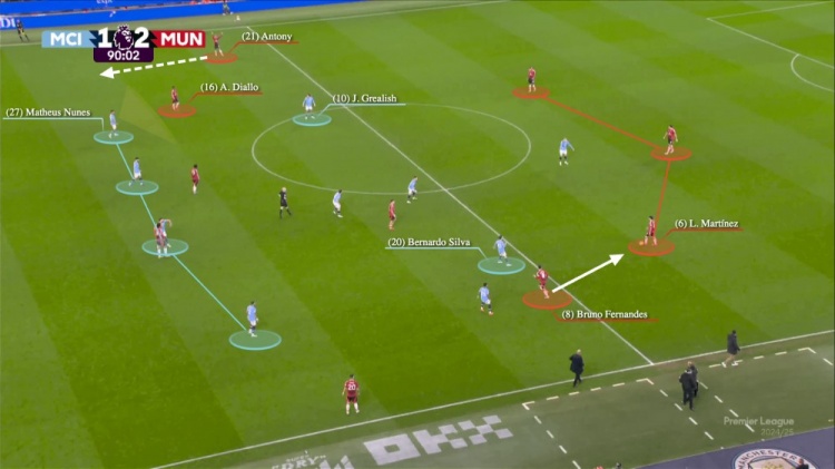 他們?cè)谥新返姆朗睾芫o湊,但曼聯(lián)并沒(méi)有施加什么壓力。替補(bǔ)出場(chǎng)的貝爾納多-席爾瓦不確定是否是向利桑德羅-馬丁內(nèi)斯施壓,還是等待布魯諾-費(fèi)爾南德斯的跑動(dòng)——后者在邊路游弋。下面這個(gè)瞬間,我們能明顯看到哈蘭德希望貝爾納多-席爾瓦能夠施壓。