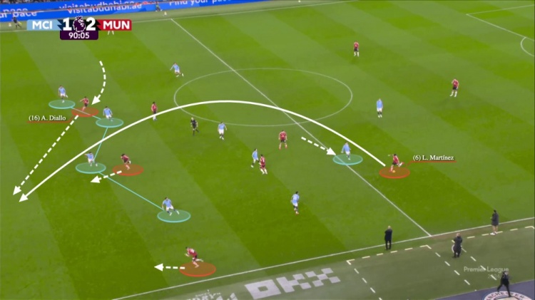 曼聯(lián)的制勝進(jìn)球是令人震驚的,尤其是上半場(chǎng)早些時(shí)候利桑德羅-馬丁內(nèi)斯在身后為霍伊倫送出了幾乎相同的傳球。曼城根本就沒(méi)有吸取教訓(xùn)。