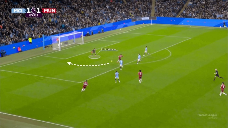 為了應(yīng)對(duì)曼聯(lián)的進(jìn)攻,埃德森保持了一個(gè)較高的站位,但沒(méi)有進(jìn)一步向前采取動(dòng)作。當(dāng)球進(jìn)入曼城禁區(qū)之后,阿瑪?shù)路磻?yīng)迅速,帶球突破埃德森,小角度完成破門。