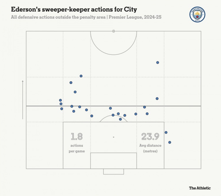 曼城的防守缺陷,使得他們對(duì)埃德森的清道夫門將屬性要求更高了。他的場(chǎng)均1.8次撲救和23.9次的場(chǎng)均禁區(qū)外動(dòng)作,是他自2021/2022賽季意義來(lái)最高的,當(dāng)時(shí)分別為1.5次和25.3次。